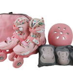 Kitul include: role reglabile, casca de protectie, protectii pentru coate si genunchi si un ghiozdan pentru transport.