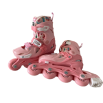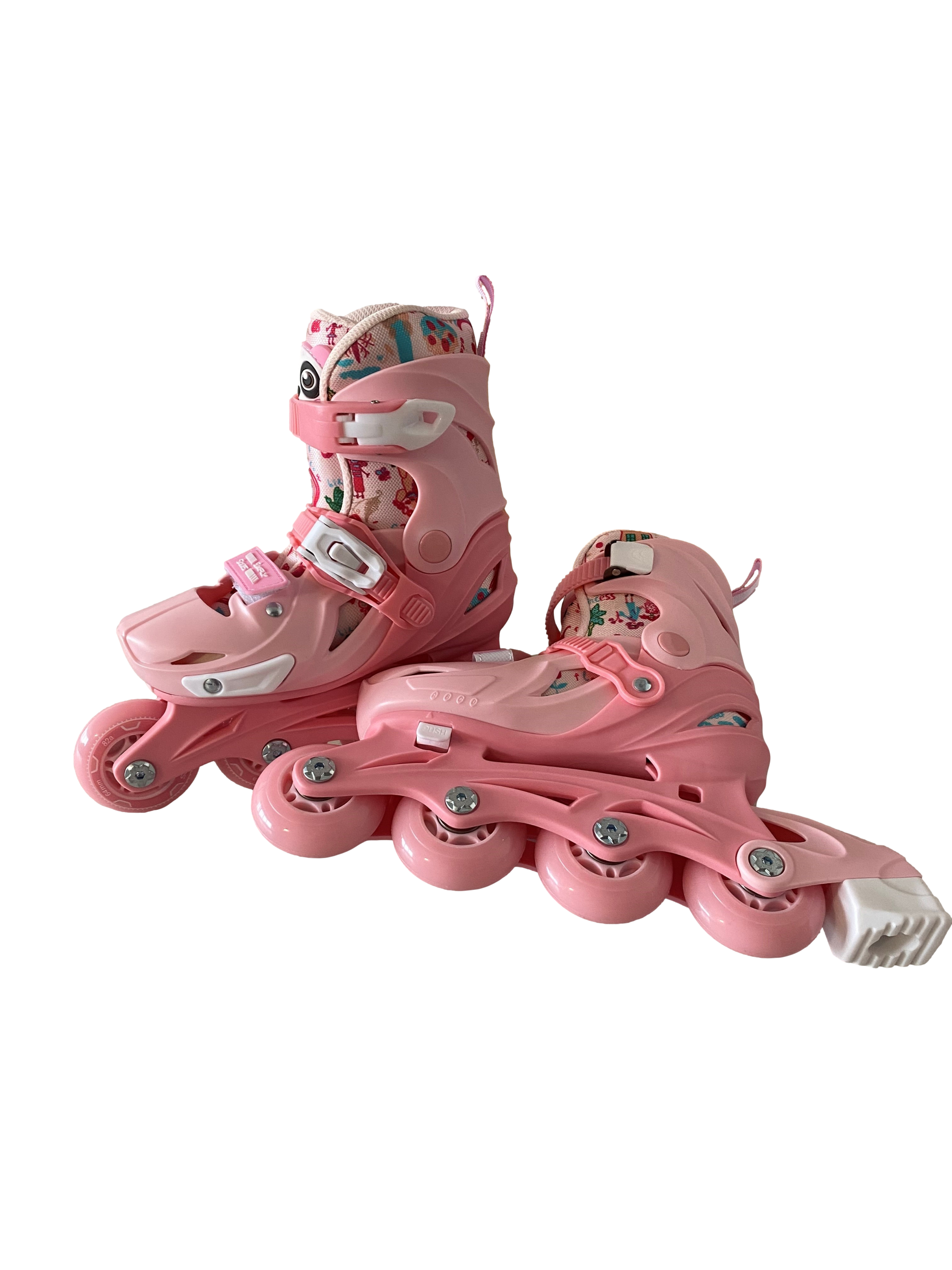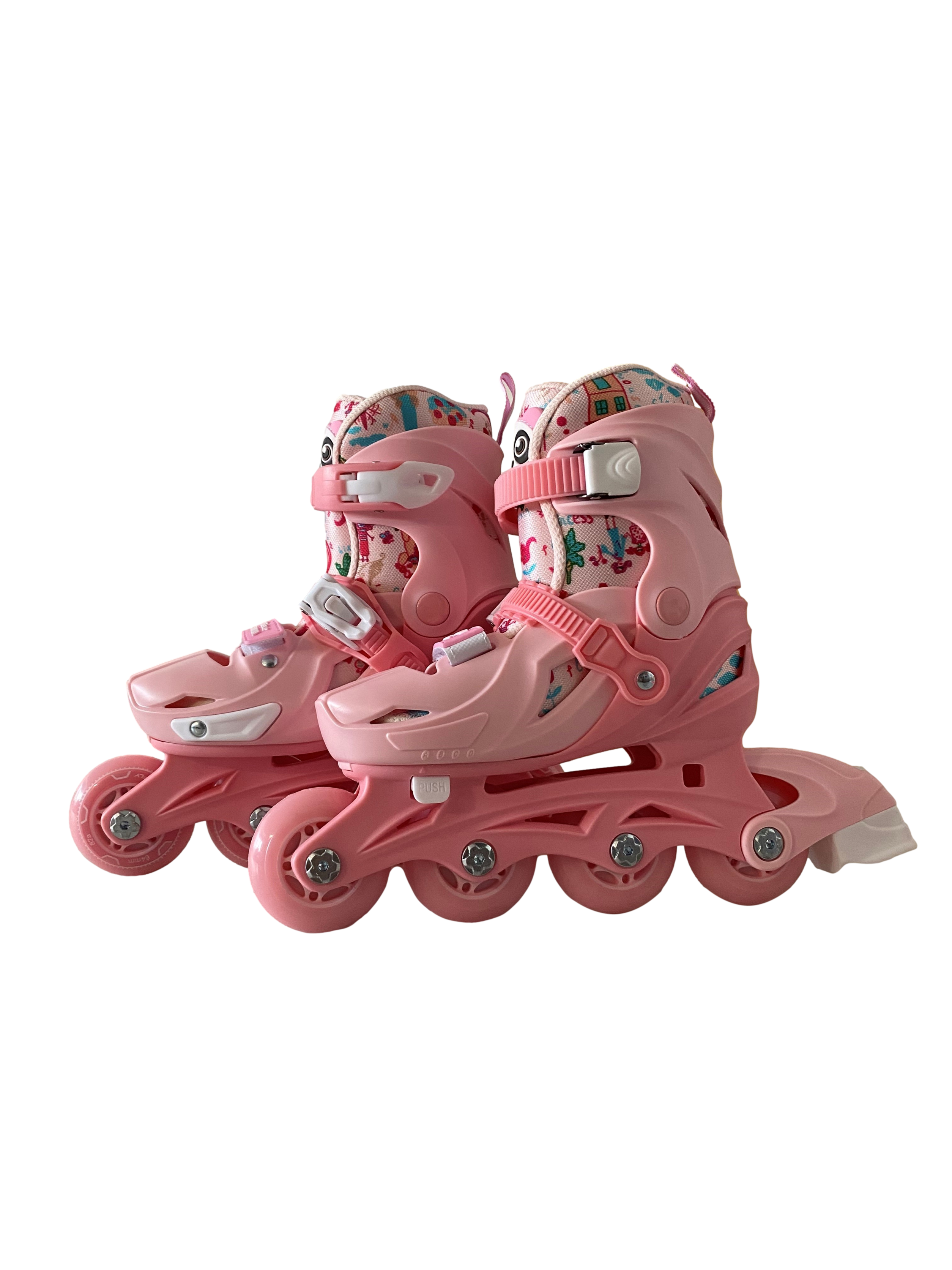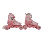 Set role Fly Skates-marimea S(29-32) reglabile, cu patru roti, casca si protectii, Roz corai